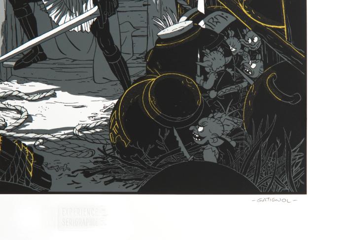 Superbe illustration de la couverture du tome 17 de Donjon Monster (éditions Delcourt) réalisée par l'auteur Bertrand Gatignol et habillée de doré pour la sérigraphie.
