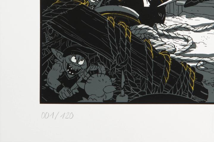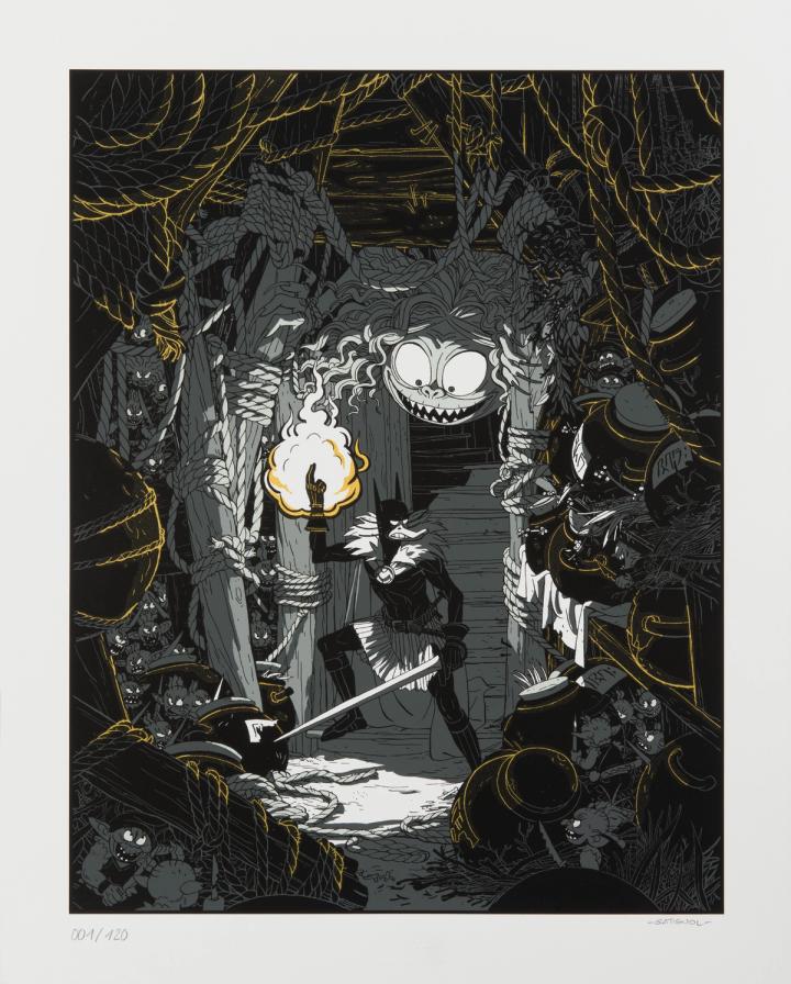 Superbe illustration de la couverture du tome 17 de Donjon Monster (éditions Delcourt) réalisée par l'auteur Bertrand Gatignol et habillée de doré pour la sérigraphie.