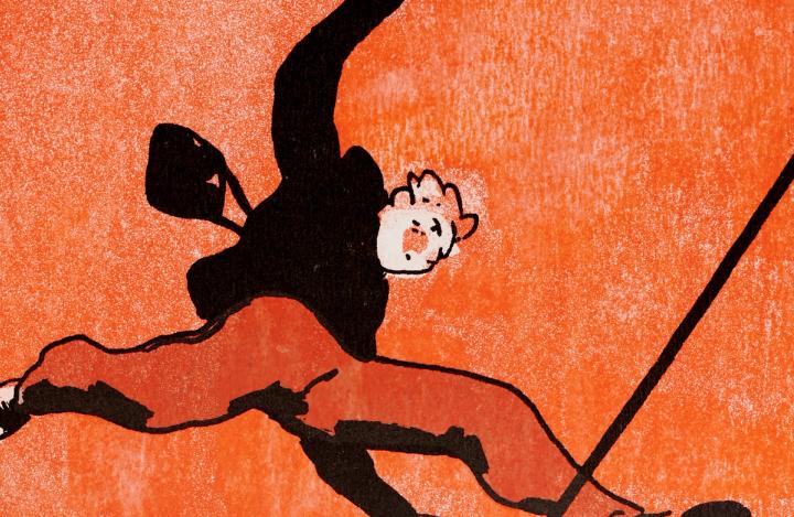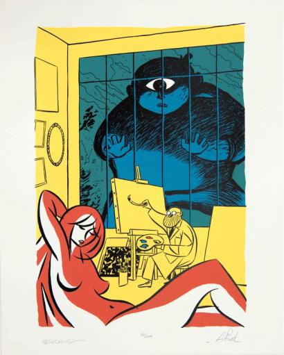 En recevant son dessin nous avons eu envie d'essayer quelque chose de nouveau : mélanger la gravure et la sérigraphie. Nous avons demandé à Marie Eyquem (notre ancienne sérigraphe) de réaliser sur sa presse le fond orange de l'image permettant un rendu qui ne serait pas possible en sérigraphie. Nous avons ensuite ajouté 2 couleurs pour faire apparaitre le reste du dessin.